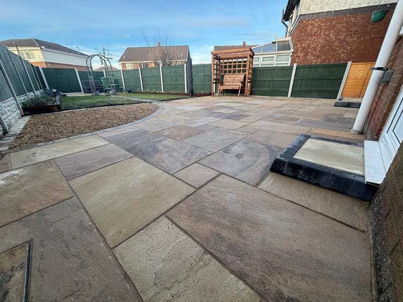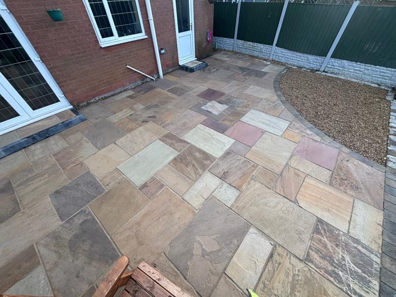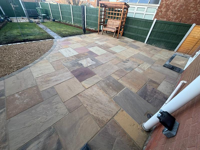 The Indian sandstone slabs were carefully laid by hand, with attention paid to alignment, spacing, and overall layout. Natural stone patios require experience and precision, as each slab has unique colour tones and surface textures.