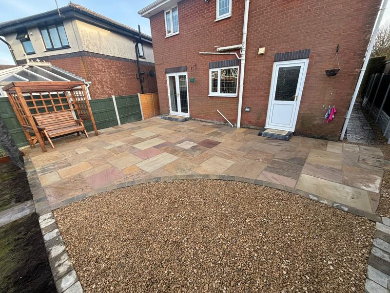 The result is a bright, spacious, and practical patio area, perfect for outdoor seating, entertaining, and everyday use. The combination of Indian Sandstone, clean edging, and decorative gravel has completely transformed the garden into a low-maintenance and visually striking space.