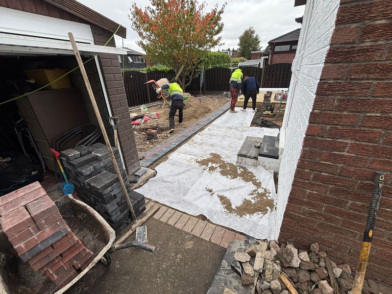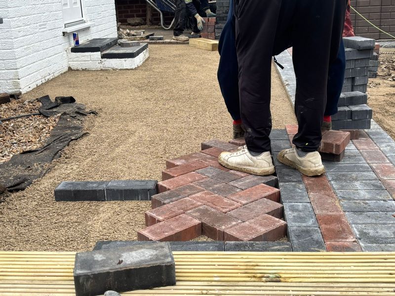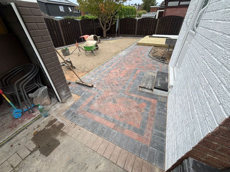 - We then installed a new block-paved path in a 45° herringbone pattern, complete with a charcoal border for contrast and definition. This path ties the whole garden together while adding a touch of sophistication to the layout.