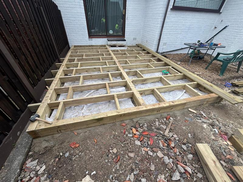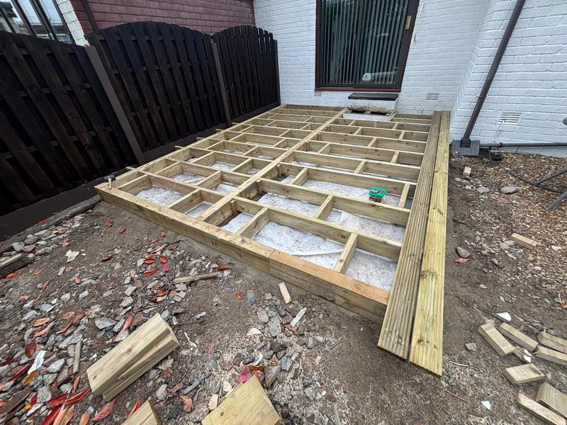- A solid timber framework was built and finished with premium decking boards, providing a stylish raised seating area directly outside the patio doors – ideal for outdoor furniture and summer gatherings.