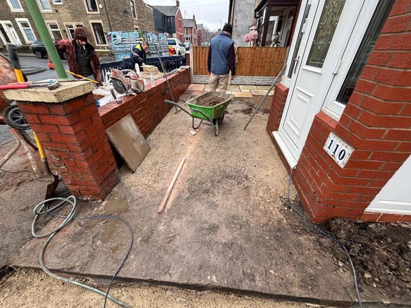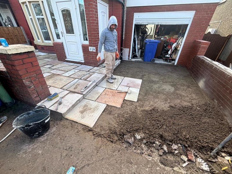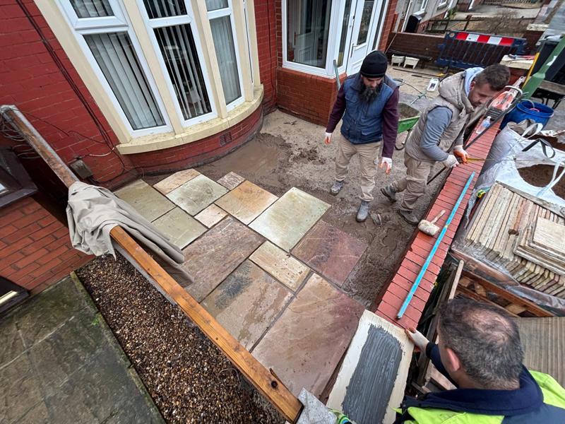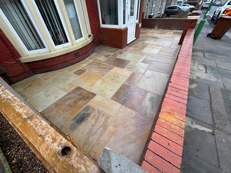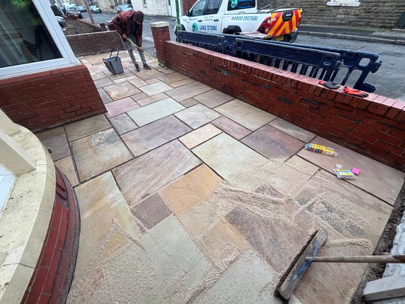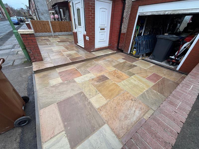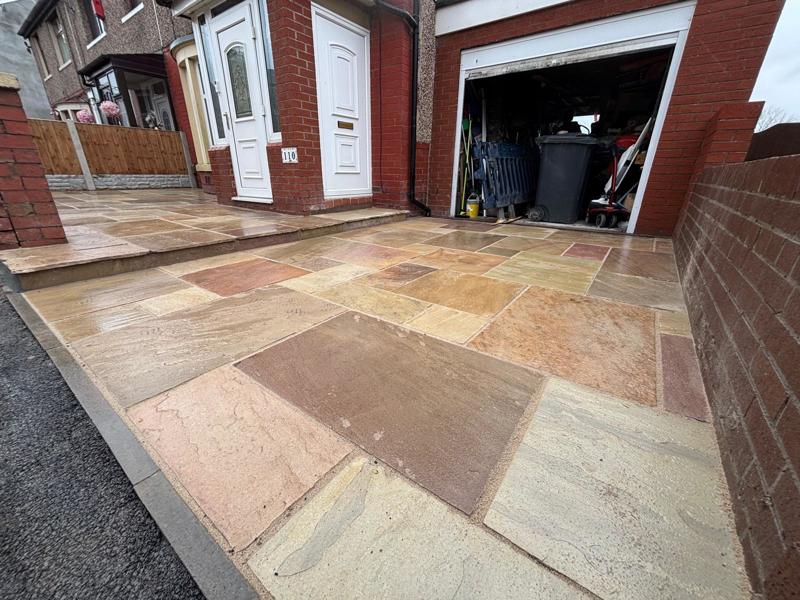 Indian sandstone was chosen for its natural colour variation, long lifespan, and slip-resistant surface, making it an ideal option for outdoor paving in Lancashire’s changing weather conditions.